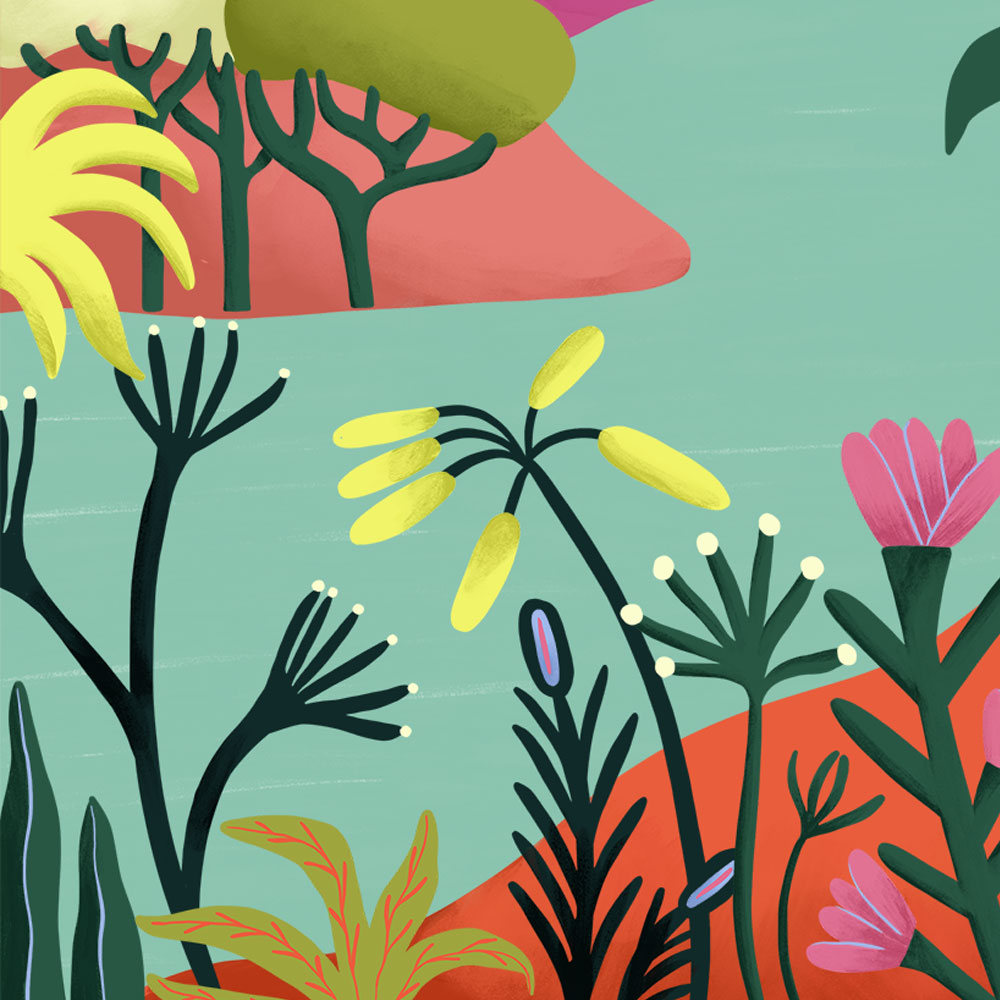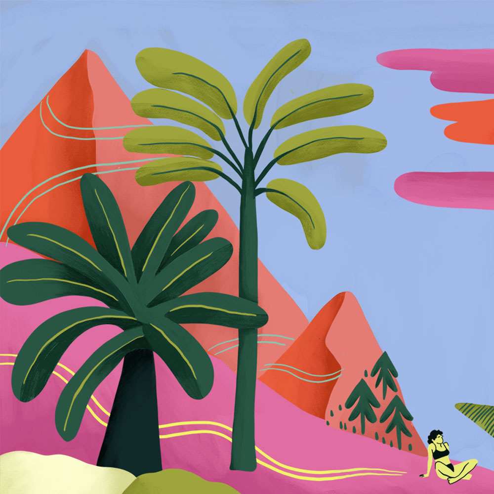 Une végétation luxuriante encadre la scène, dense et apaisante, comme un paradis caché au bord de l’eau. La lumière filtre entre les feuilles, l’air semble tiède, et tout invite au calme. C’est un havre de paix où le temps ralentit. Au loin, une femme est assise, tournée vers le paysage. Elle contemple l’horizon, immobile, habitée par le silence. Sur l’eau, un homme s’approche en barque, glissant doucement vers elle. Une rencontre qui se dessine, discrète, presque suspendue.