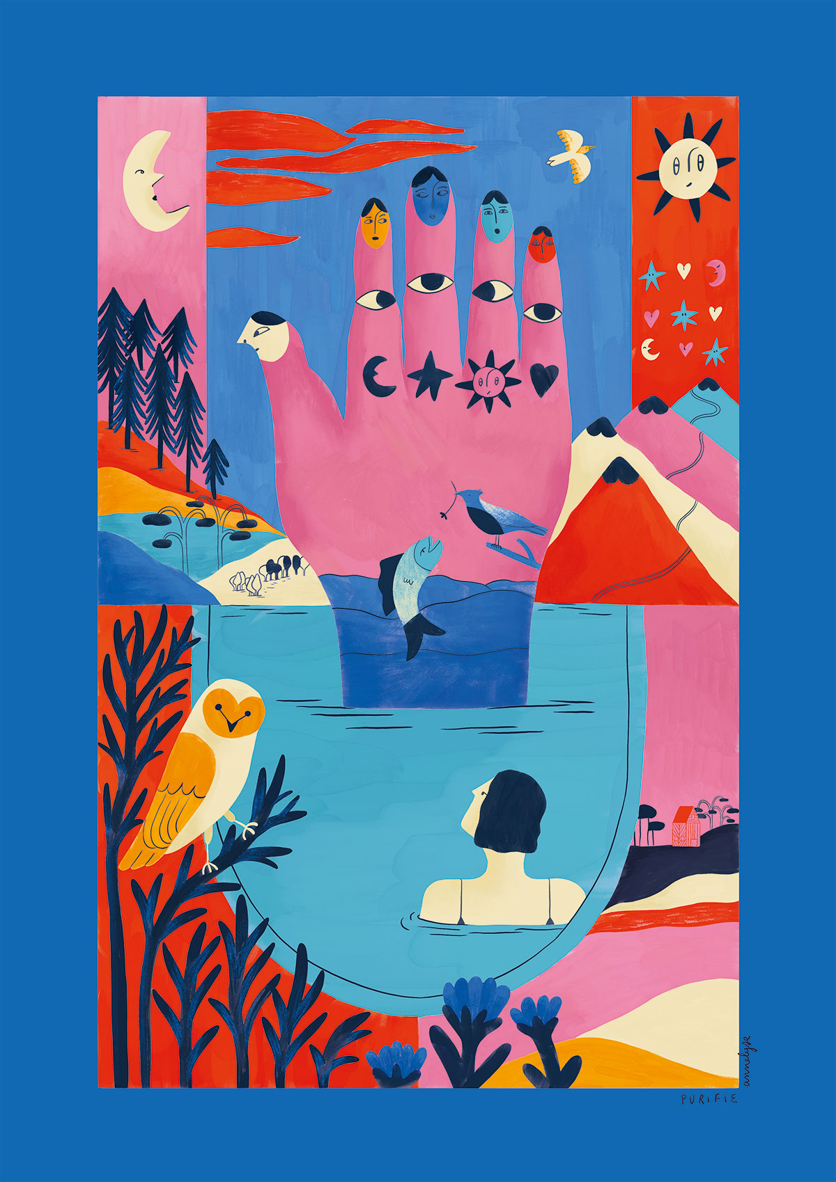 Sous l’œil rassurant de la chouette, gardienne du passage, elle se baigne. La main qui émerge de l’eau porte la mémoire de ce qui a été écrit. L’encre se dissout, la main redevient blanche. Autour, la cabane abrite le retour à soi, la lune invite au repos, le soleil à la renaissance. L’eau purifie, non pour effacer mais pour permettre le recommencement — un temps de nettoyage avant la nouvelle trace à venir.