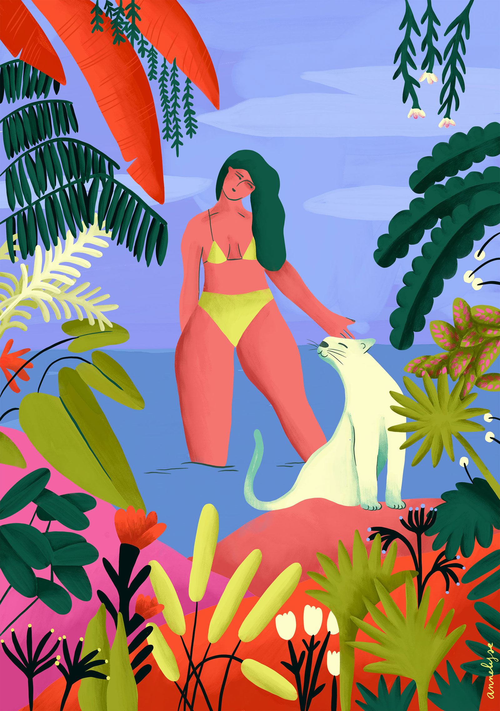 Deuxième chapitre de la série PARADIS. Elle est au bord de l’eau et, cette fois, un fauve blanc est avec elle. Ils se retrouvent après de longs mois de séparation. On comprend qu’ils se connaissent bien et qu’un lien fort les unit. Le fauve l’aime profondément, et elle l’aime aussi. Leur relation est simple et évidente. Dans cette scène, ils partagent un moment ensemble, comme si le reste du monde pouvait attendre. Ils sont simplement heureux de se retrouver.